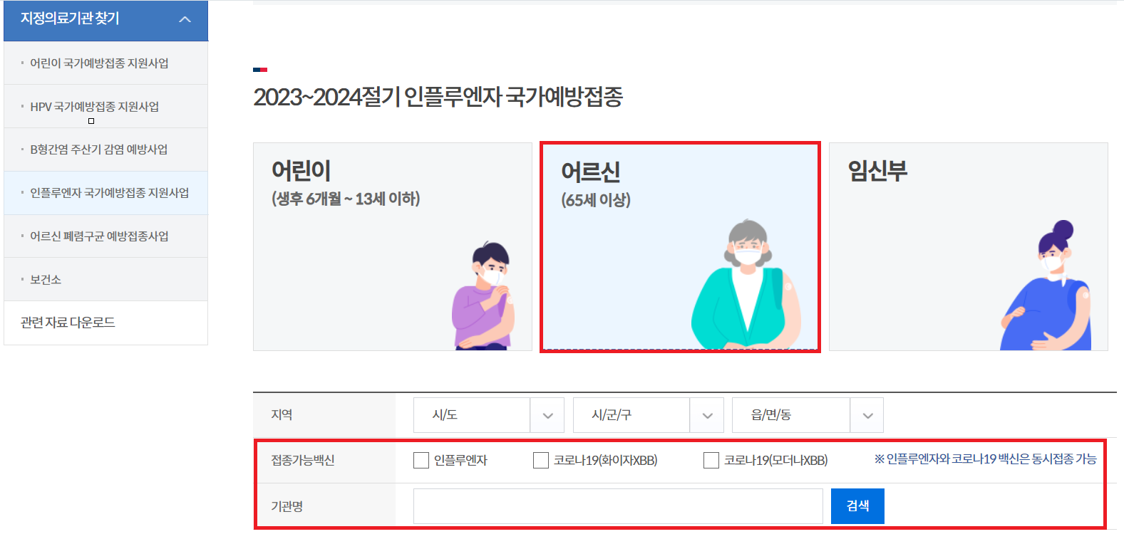 예방 접종도우미 누리집 → 지정의료기관 찾기→ 인플루엔자 국가예방접종 지원사업