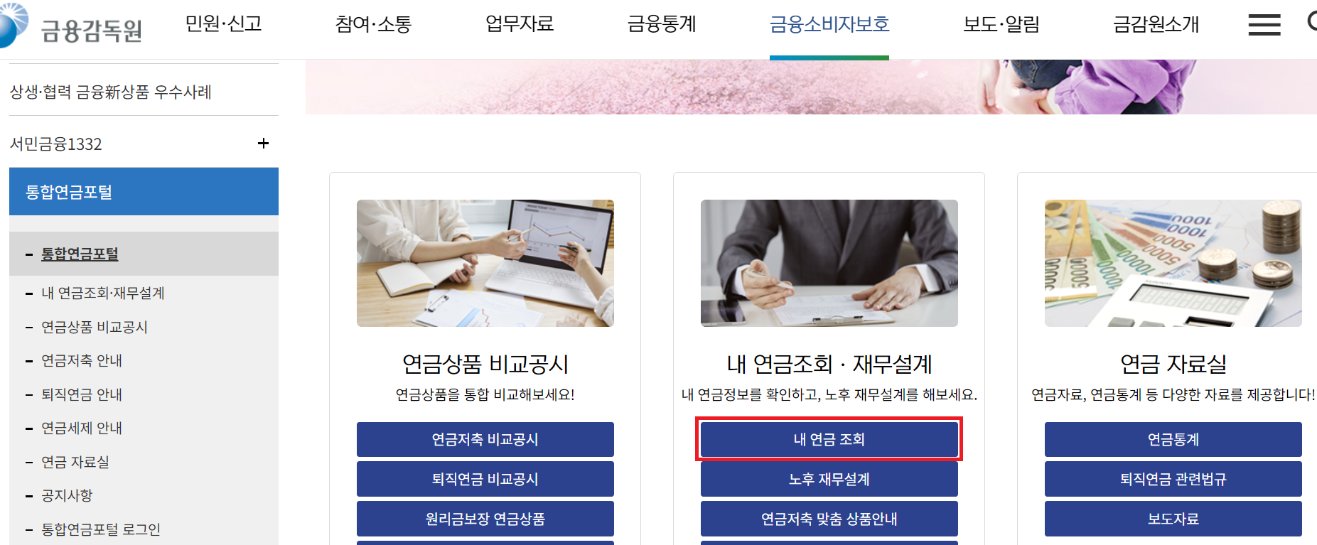 금융소비자보호탭의 통합연금포털에 들어갑니다.
