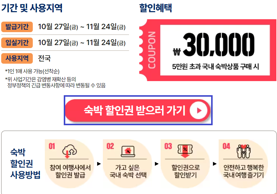 5만 원 이상 숙박시설을 예약할 때 3만 원을 할인받을 수 있는 할인 쿠폰을 제공한다고 합니다.