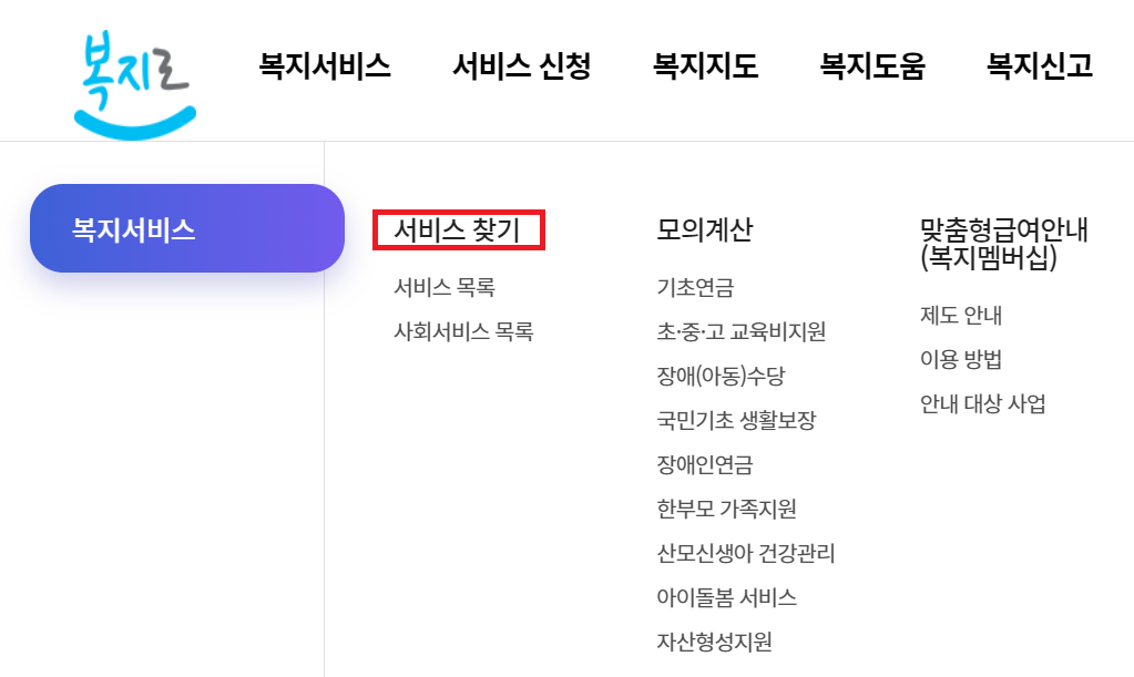 온라인은 복지로 사이트에서 복지서비스-서비스 찾기에서 확인할 수 있습니다.